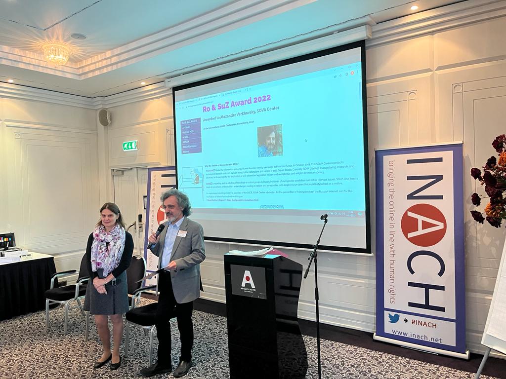 Eesti Inimõiguste Keskus on juba aastaid Rahvusvahelise Kübervaenuvastase Võrgustiku (INACH) liige. Võrgustik tähistas hiljuti oma 20. tegevusaasta täitumist ja 3.-4. novembril toimus Amsterdamis sel puhul konverents „20 years of combating cyber hate: Lessons learned and future challenges”. Lisaks anti ürituse lõpus üle Ro & SuZ auhind, millega tunnustatakse inimõiguste ja võrdse kohtlemise eest seisvad vabaühendusi. Sel korral pälvisid kõrge auhinna Moskvas loodud SOVA keskus ja selle juhataja Alexander Verkhovsky.