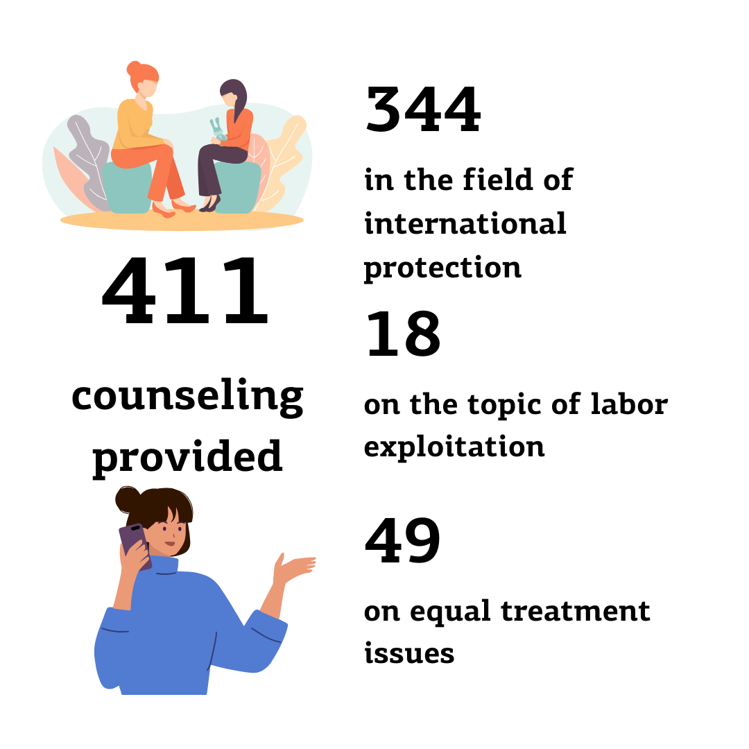 Our primary task is defending people’s rights, which we do through counseling and litigation. Over the year, we provided legal guidance to nearly 500 individuals, mainly on international protection, equal treatment, and labor exploitation. Refugee lawyers were primarily approached regarding asylum extensions, deportation risks, and family reunification. In the second half of 2024, we focused on employment exploitation of Ukrainians. To our surprise, we encountered severe cases, including workplace accidents where employers refused to take responsibility for injuries, non-payment of wages, and wrongful terminations.