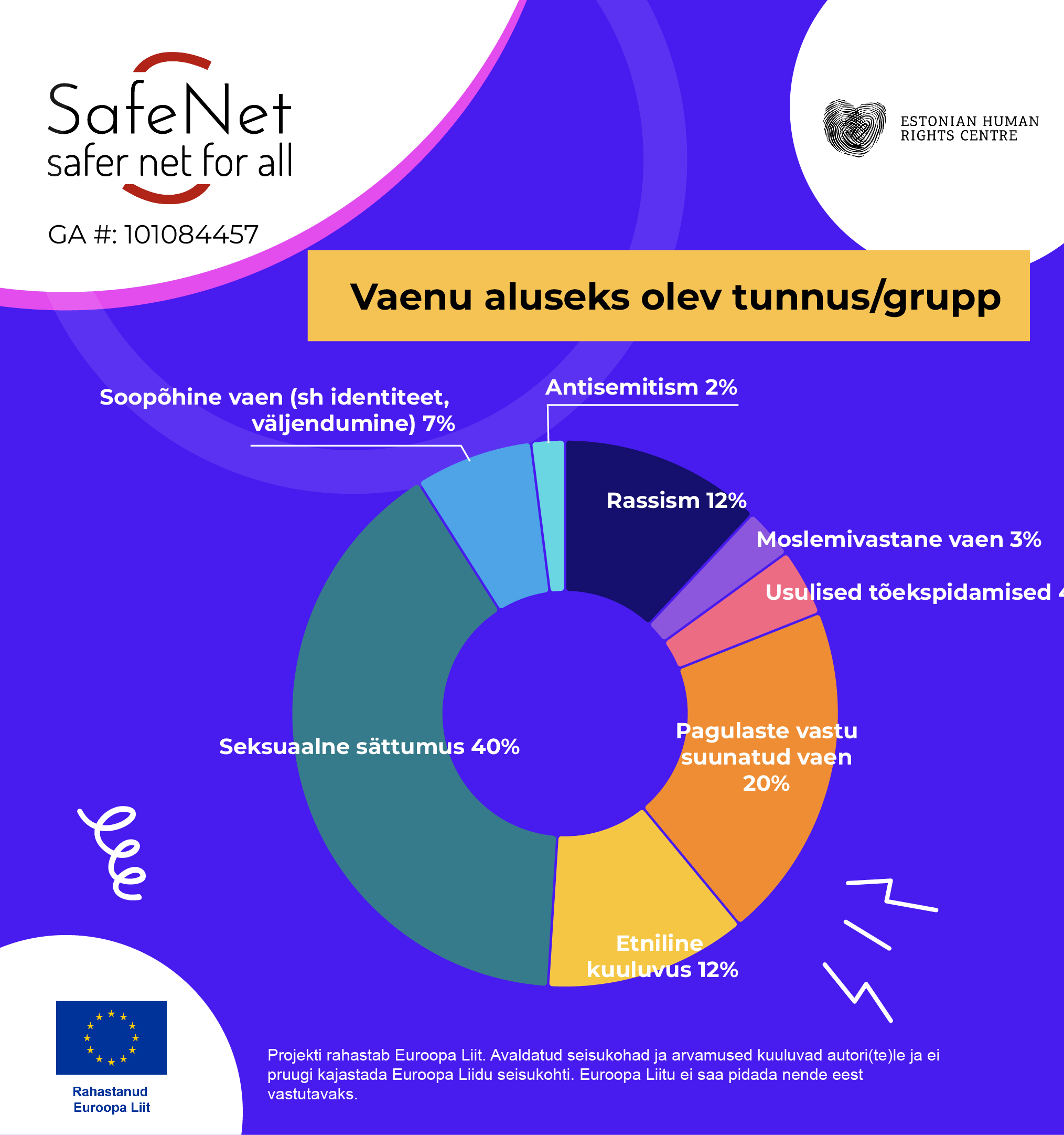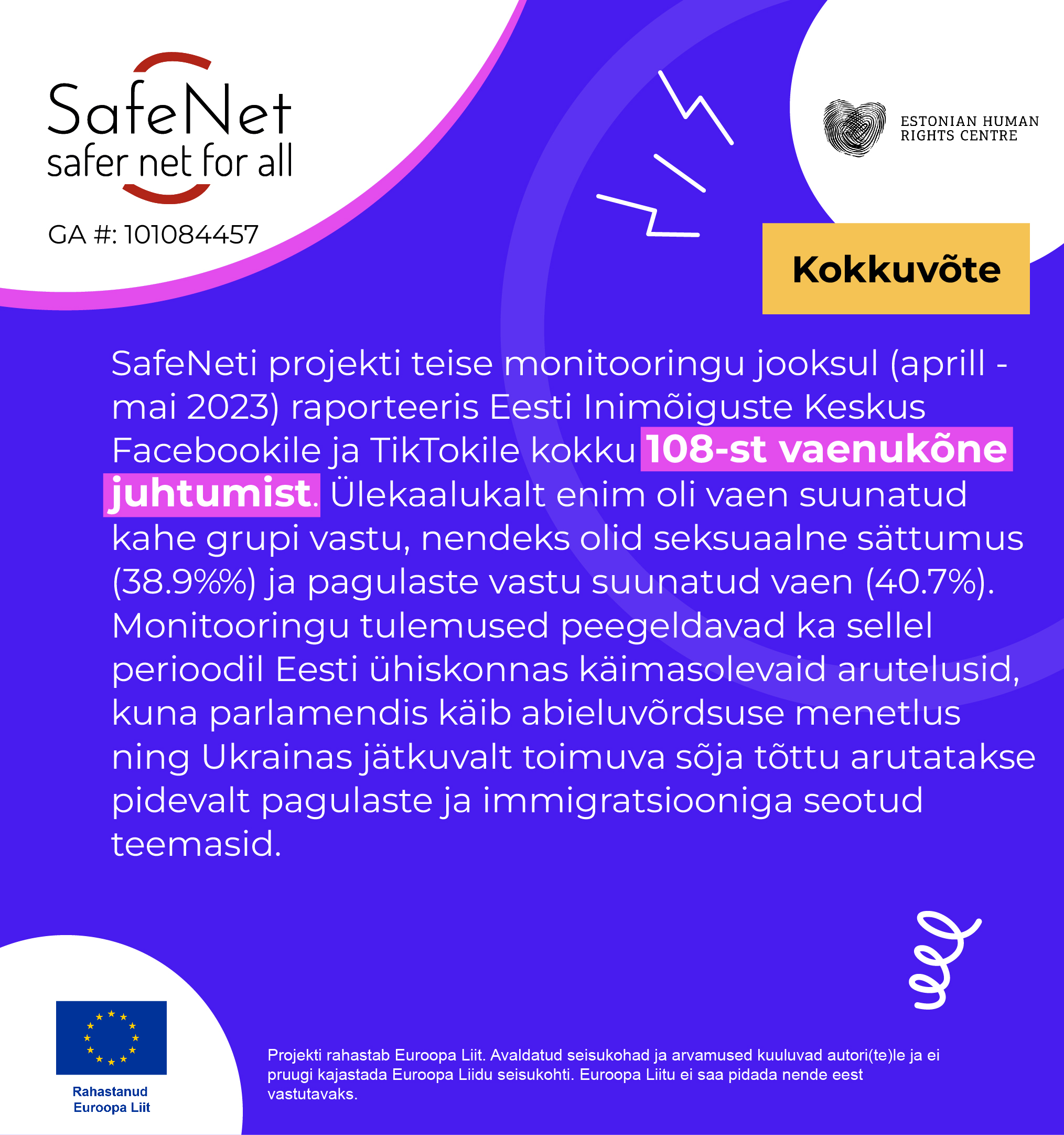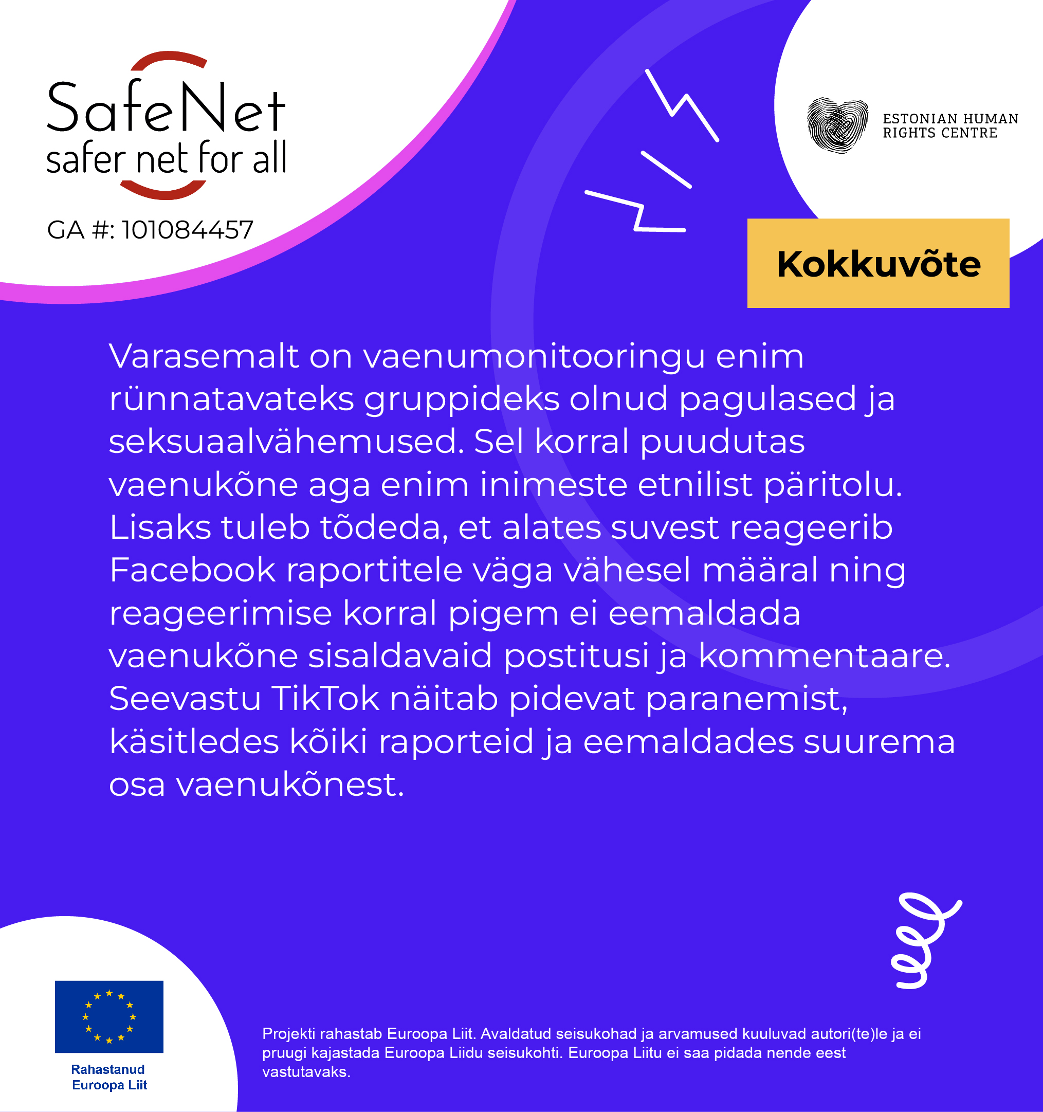 Euroopa vabaühendused on aastaid monitoorinud vaenukõne levikut sotsiaalmeedias ning sotsiaalmeediaplatvormide lähenemist vaenu eemaldamisele. Inimõiguste keskus osaleb partnerina projektis SafeNet, mis jätkab seniseid pingutusi ambitsioonikamalt: suurenenud on osalevate vabaühenduste ring ning kaasatud on pea kõik Euroopa riigid. Projekti juhtpartner on internetis leviva vaenukõne vastu võitlev rahvusvaheline võrgustik INACH, kaasatud on 21 vabaühendust üle Euroopa.